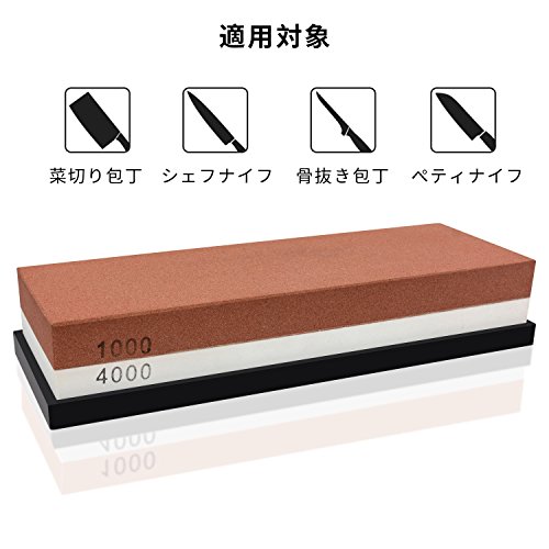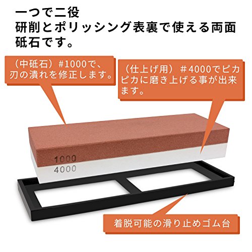 - 一つで二役:研削とポリッシング表裏で使える両面砥石です。#1000で、刃の潰れを修正したりして、最後に#4000でピカピカに磨き上げる事が出来ます。#4000で磨けば、切れ味が抜群となります。砥石を何個も用意する必要はありません。