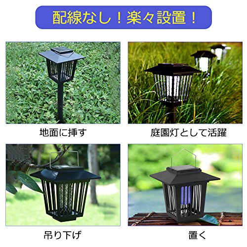 - 【3way設置方法&25㎡大範囲対応&防水】●虫取り有効範囲は最大25㎡まで実現、さらにこの電撃殺虫灯は3種の設置方法を持って、水平置きてもOK、地面に埋め込んでもOK、吊下げてもOK、使い勝手抜群。●台所・居間・玄関先・寝室・ベランダ(軒下)庭・園芸・公園などインドア&アウトドアにピッタリ。匂いなし殺虫機ですので、飲食店やその他店舗などにも設置できます。薬剤を一切使用していないので無害です。人に優しく、オフィスや事務所のエントランス、病院の待合室などにもオススメです。●防水仕様(レベルIPX4)だから雨の日も大丈夫。