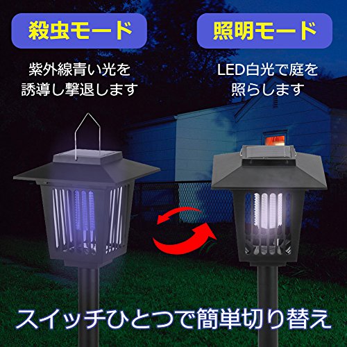 - 【2モード:殺虫&照明】2モード切り替え簡単、蚊取り器&ガーデンライトの1台2役!スイッチひとつで簡単に切り替えができます。『スイッチON1』照明モードは明るいLEDライトで庭を照らし。『スイッチON2』殺虫モードでは紫外線青い光が虫を誘導して撃退します。『スイッチOFF』滅灯。電撃ショックで瞬時に撃退ができるので、害虫が多い庭先や花壇、玄関まわり、インドア或いはアウトドアに最適です。