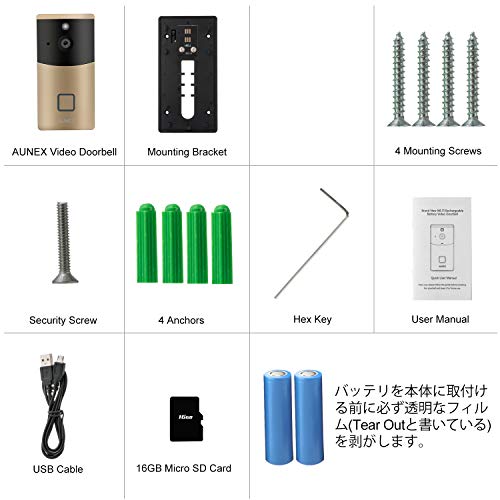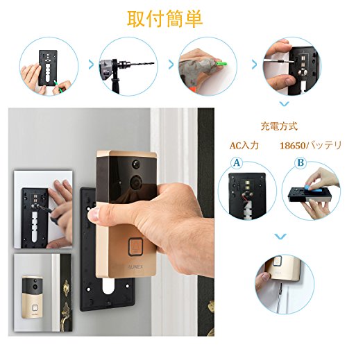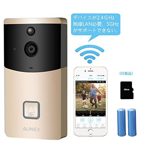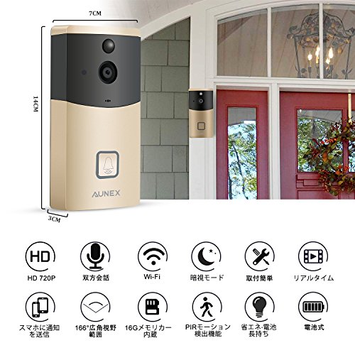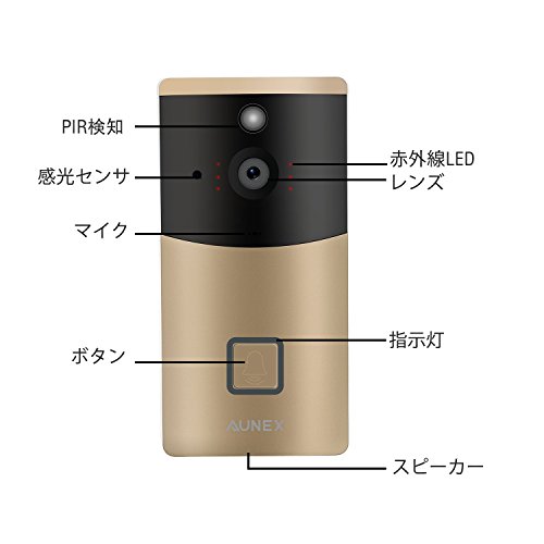インターホン ビデオドアベル ネットワークカメラ AUNEX ワイヤレスチャイム 可視ドアベル Video Doorbell ホームセキュリティ 防犯対策 暗視機能 防塵防水 金色