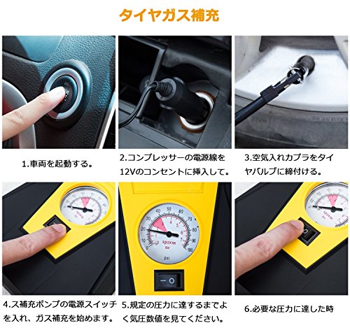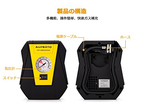 - 効率高い空気インフレ―トポンプ:強い気流はタイヤを素早く膨張させる。3-7分間で中型自動車のタイヤに空気を入れることができる。
