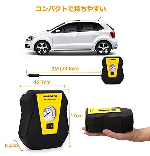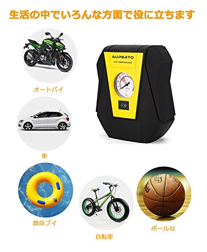 エアコンプレッサー AUPERTO車用空気入れ DC 12V コンパクト シガーソケット接続式 3種類アダプターノズル付き自動車 バイク ボール 浮き輪 レジャー用品
