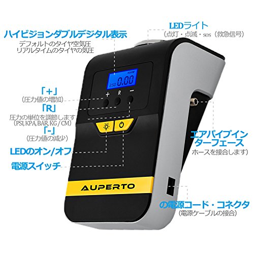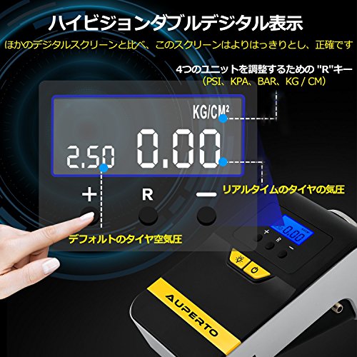 - ⚛【スマート・エアレーション】 4つの圧力単位(PSI, KPA, BAR, KG / CM))があって、「R」を調節して、圧力単位が選べます。エアレーションのタイプが二つあります。一つはタイヤの圧力をテストして起動させます:「+」や「-」のボタンを押して測定し、明滅することが止まると、そしてパワースイッチを開けて、必要の圧力に達したら、圧縮機は自動的にエアレーションを停止します。もう一つは、手動で「+」/「-」ボタンを押してデフォルト値を設定して、スイッチを起動してエアレーションすることができます!