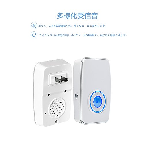 - 【多様化受信音&音量調節】ワイヤレスベルの呼び出しメロディーは51種類で、お好みで選択できます。送信機1個、受信機2個のセットなので、1階と地下室、ガレージ、または2階がある場合、1つの送信機ボタンを押しても両方の領域が鳴り、来訪者と出違うことがなく、広い家でも安心できます。また、ベルは0dB~100dBの範囲内でボリュームを4段階調節でき、様々なニーズに満たします。