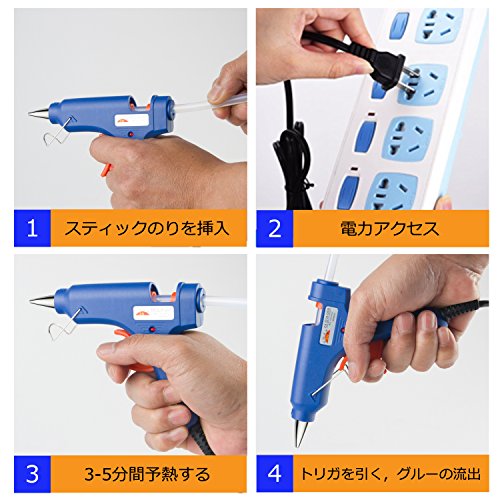 ▲使用方法: 1、コードをコンセントに差込み、スイッチをください、専用スティックを挿入する。 2、ヒーター温度が適温になるまで約3-5分間待つ。 3、接着したい部分にノズルを当て、溶けたスティックを押し出す。 4、約20~30秒でほぼ硬化、スピード接着なので素早く接着すること。