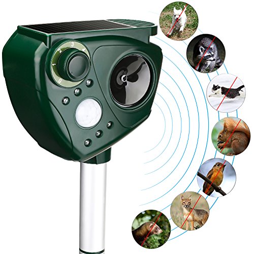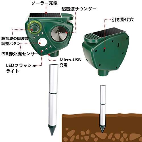 - 【効果抜群、無毒無害】超強力PIRの超音波の機能は近くの動物の音波を感知し、超音波機能に触れて動物を脅かす効果を得られます。動物よけ効果増強、超音波動物除けの赤外線感知センサーが野良猫や犬、ネズミ、鳥、カラス、ハクビシン等の野生動物の動きを検知し、動物が嫌な超音波とLEDフラッシュを発して、野良猫達を傷つけずに追い払います。改良版の動物撃退器は赤外線感知センサー部分と周波超音波頻度、六つのLED強フラッシュの改良により、検知範囲が広くなり、対応動物種類も増え、退治効果増強できました。