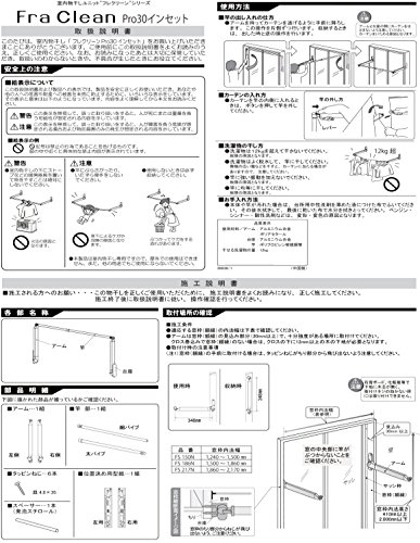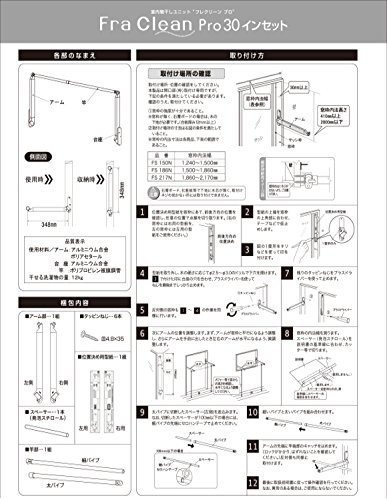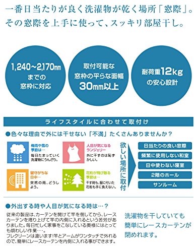 「部屋干し」の新発想、快適な暮らしをスッキリお手伝い。室内物干しユニット【フレクリーン プロ30インセット】 一番日当たりがよく洗濯物が乾く場所「窓際」を上手に使ってスッキリ部屋干し。窓枠取付で場所要らず!軽い力で昇降できるシンプル機能で収納時もスッキリ。 仕様/竿カラー:ホワイト アームカラー:グレー 材質/アーム:アルミニウム合金 ポリアセタール ベース:アルミニウム合金 竿:ポリプロピレン被膜鋼管寸法 ●1240mm~2170mmまでの窓枠内寸法に対応。 ●窓枠の平らな面積30mm以上。 ●窓枠内法高さ410mm以上2000mm以下 ●使用しない時には竿ごと窓内々に収納できます。 ●洗濯物を干していても簡単にレースカーテンが閉めれます。 ●窓枠内側に入りながら昇降する特殊機能 ●木製窓枠の場合は付属の付属のタッピンねじで取付可能。 ●耐荷重12kgの安心設計。 取付に関する注意事項 ●窓枠の強度が十分であること。窓枠がなく、石膏ポードの場合は木の下地が必要です。(合板厚み12mm以上) ●取付場所が適用窓枠寸法の範囲内であること。 ●取付工事が必要な商品です。当店では取付工事はお受けできません。ご了承お願いします。