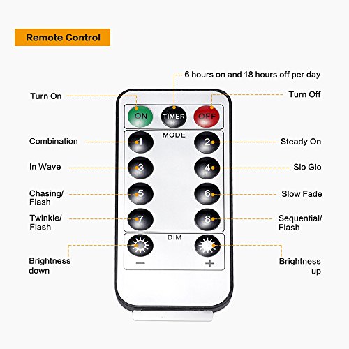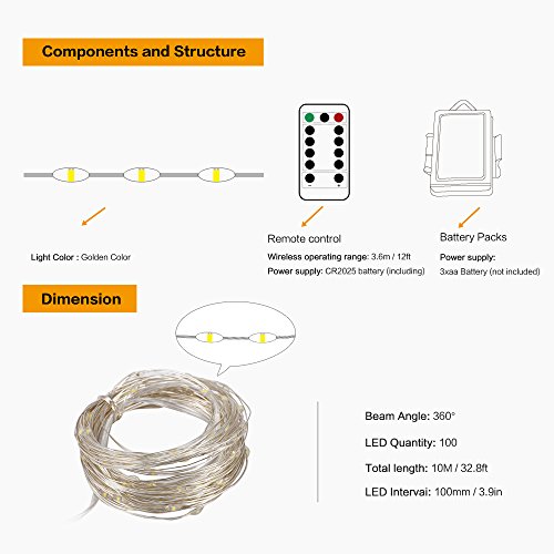 - ライト色:ゴールド色です。製品の長さ: 10 m / 32.8 FT。LED数量: 100個。電源: 3 X AA電池(商品には含まれません)、cr2025電池(含む)リモート。バッテリーパックサイズ: 8 × 6 × 2.2 / 3 " × 2.4 " × 0.9」を参照してください。