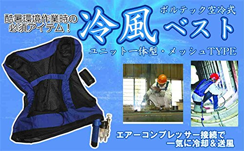 AW-Net 空冷式 冷却ベスト 作業着 エアー コンプレッサー 接続 0.4MPa 以上 油水分離器 付 冷却器 クーレット チューブ 内蔵 溶接 酷暑 作業 に 「ボルテックスチューブの原理」旋回気流の中心温度が周辺部の温度より低くなる渦動理論の原理を応用した冷却器を搭載した、圧縮空気使用の冷却ベストです。 本体内に圧縮空気を送ると、冷風は配管チューブへ熱風は外へ分離して排出され、体感温度が約10度低下。夏の作業時における熱中症対策に最適です。 ベストはメッシュタイプ。穴あきエアホースが配されており、エアーコンプレッサーなどで圧縮空気が供給できればどこでも使用可能です。 (サイズ)着丈 約53cm 胴囲 約110cm 冷却器:約19cm 冷却器ベルト:約114cm ※バックル式 (セット内容)冷却器、冷却器ベルト、メッシュベスト ※PL保険加入済 ※ベストを着用後、コンプレッサー側のコネクタに接続することにより、冷たい空気がパイプをめぐっていくことを確認してください。※圧縮空気のみ使用可。他のガスでの使用は厳禁です。※空気圧は必ず10気圧よりも低く設定してください。高すぎると本体配管が破裂する可能性があります。