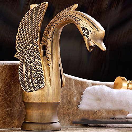 awxjx Washroomシンクミキサータップ銅ヨーロッパレトロスタイルホットとコールドゴールドSit Swan洗面台シングルハンドル1つ穴
