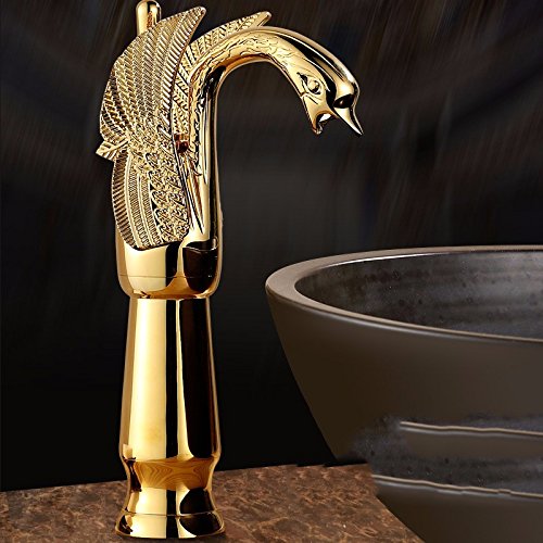 awxjx Washroomシンクミキサータップ銅ヨーロッパレトロスタイルホットとコールドゴールドSit Swan洗面台シングルハンドル1つ穴
