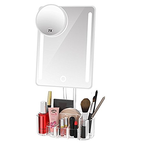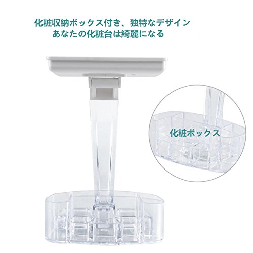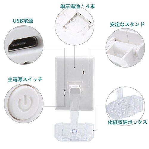 - 【収納機能付き&2つのスイッチ】ミラーの台座には化粧ボックスが付くので、色々な化粧品を収納することができます。材質は軽くて丈夫で、透明なPS製で、中身は一目で見えて、物を探しやすいし、整理もやすいです。おしゃれな収納ボックス! ミラーの背面にON/OFFスイッチがあります。ONにするとき、正面のタッチボタンを指先で一回押すと、ライトが点灯します。もう一回押すと消灯します。長押すと明るさが明るくしたり、暗くしたり調整できます。