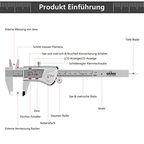 - 最高標準の品質♥Aickarデジタルキャリパー6インチは、深さ測定プローブと精密なジョーを備えた硬化ステンレススチールによって造られた。 埃、昆虫、水を防ぐ機能を規定するIP グレード54の要求も満たす。