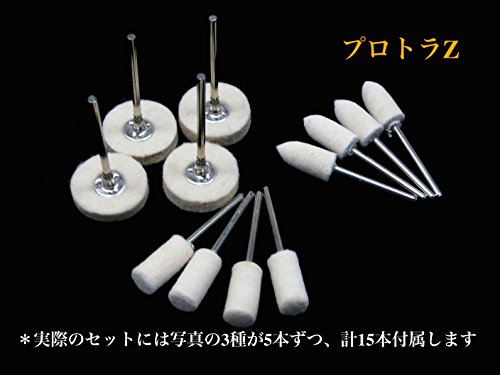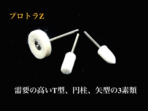 - 金属研磨作業の必需品フェルトバフとのセットも、需要の高いT型、円柱、矢型の3素類を5本ずつ計15本
