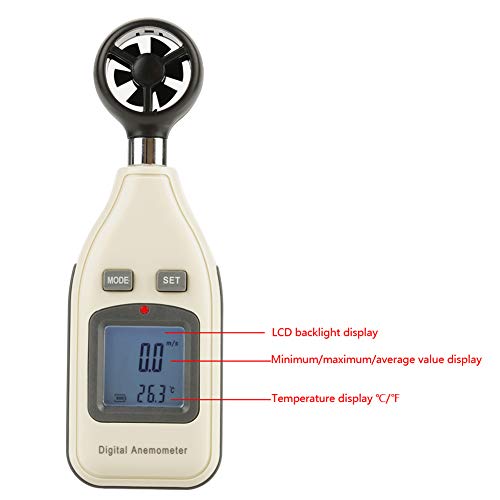 - 【ユニークな特徴】風速と風速を測定するための赤道風速計です。最小/最大/平均値表示をサポートしています。温度表示は℃/℉です。 LCDディスプレイは、便利な読み取りのためのバックライト機能を備えています。 14分で操作がない場合、自動パワーオフ。また、風速計はバッテリー残量表示機能も備えています。使用に便利です。電池を入れてからMODEボタンを数秒間押し続けると電源が入ります。