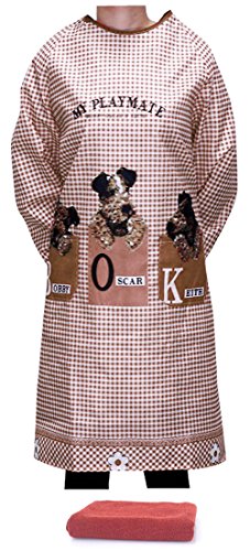 ロング スモック 大人 長袖 割烹着 絵画 ガーデニング 作業着 かっぽう着 保育士 保育用 ギンガム チェック 犬柄 フリーサイズ 犬 (ブラウン/茶)
