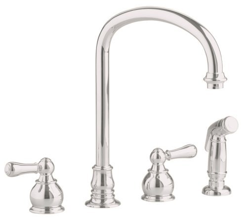 Metal lever handles. Coming in your choice of finish, the American Standard Hampton 4751.732 Double Handle Kitchen Faucet has a perfectly classic look and smart versatility to fit your kitchen. This solid brass faucet is made to last and can easily resist corrosion and bacteria. A high-arcing spout means you won't need to worry about struggling to fit bigger pots and pans in the basin. Its two handles let you smoothly dial in the ideal temperature while the pull-out sprayer provides great pressure to blast away those hard to reach places. You can trust in the ceramic disc valving of this faucet to keep those annoying drips at bay throughout its long life. Product Specifications:Mount Type: Deck Mount Handle Style: Lever Valve Type: Ceramic Disc Flow Rate (GPM): 2.2 Swivel: 360 degrees Spout Height: 5.625-inch Spout Reach: 9.375-inch About American Standard It all begins with an unmatched legacy of quality and innovation for more than 130 years. This tradition has put American Standard in three out of five homes in America; plus countless hotels, airports, and stadiums. They provide the style and performance that fit perfectly into your life; wherever that may be. Easy installation with 4 faucet holes. Two handles for easy temperature control. Durable brass construction with your choice of finish. Ceramic disc valving assures a lifetime of drip-free performance. Convenient pull-out sprayer for easy cleaning. Manufacturer's limited lifetime warranty.