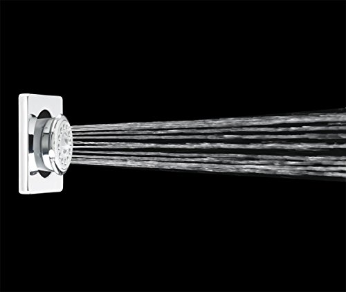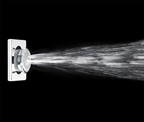 Angle adjustable. 1660140.002 Finish: Polished Chrome Features: -Flush mount.-Shape: Square.-Angle adjustable.-Easy to clean spray face.-Variable 3 function spray adjusts from conventional spray, to massage spray, to combination spray.-Spray face automatically extends when water is turned on and retracts when water is off. Dimensions: -3'' H x 3'' W x 3.94'' D, 0.8 lb.