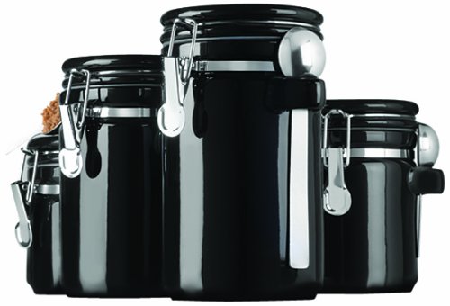 4 piece black ceramic canister set;Clamp top lid;Stainless steel spoon for each canister;Wipe canisters with damp cloth for easy cleaning;Set contains: (1) 25-ounce canister, (1) 33-ounce canister, (1) 40-ounce canister and (1) 45-ounce canister