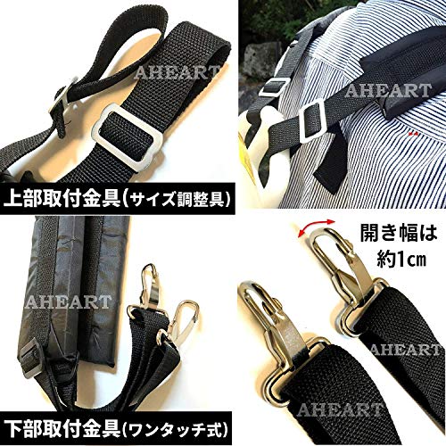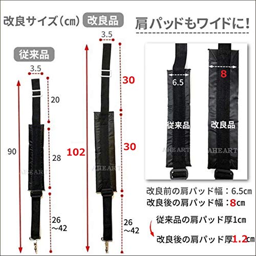 - 【取扱説明書付】/ 【素材】ナイロン/ 【重量】65g/1本(軽量設計)/ 【調整有効サイズ】上と下の調整具使用の場合60cm~102cm/ 【 ベルト幅】3.5cm/ 【 肩パッドサイズ】30cmx8cm×厚さ1.2㎝/ 【下金具の開き幅】1cm / 【耐荷重】35kg(※工業技術センターにて強度検査を実施しております。成績書あり)