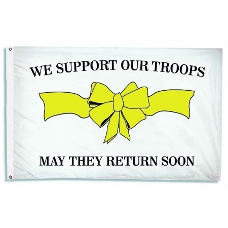 Nylon-Glo (R) we support our troops flag. May They Return Soon flag with yellow ribbon. This yellow ribbon is a traditional symbol of support for those service men and women who serve our country in foreign lands, and this bright Nylon-Glo flag will proudly display your support until the day that they return home.
