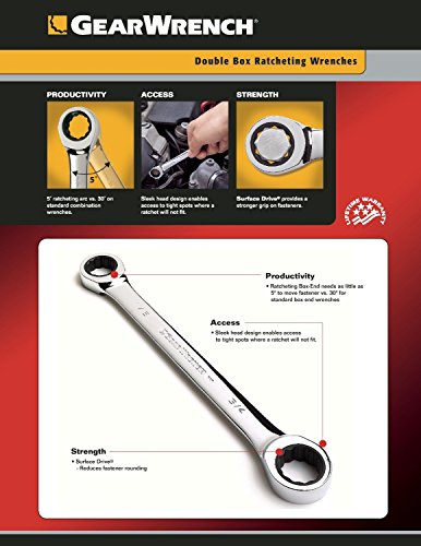 KDT85116 Features: -Surface Drive Plus? provides stronger grip on fasteners and nearly eliminates fastener rounding.-5 degree ratcheting arc vs. 30 degree on standard combination wrenches.-Improved comfort - oval shape beam.-Box end strength improved by up to 20pct.-Up to 20pct longer than standard wrenches Size stamped on both sides and on head for ease in identification..-XL Combination Ratcheting Wrench - 1/2-Inch-Inch. Warranty: -Lifetime warranty does not cover abuse..