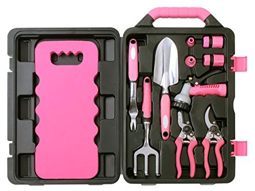 Pink had never been stronger with this beautiful and handy item!;This 11 piece garden tool kit contains useful tools for gardening needs, including a comfortable knee pad. The tools are held in a sturdy blow molded carrying case, handy to store and organize the tools.;Curve Mouth Pruners, Flat Mouth Pruners, 12 Aluminum Alloy Weeder, 12 Aluminum Alloy Trowel , 12 Aluminum Alloy Rake, Zinc Allow Spray Gun, Hose Connector: Stop Function, Quick Release, Hose Connector: Quick Release, Male Hose Connector, Female Hose Connector, Knee Pad.;Lifetime Warranty provided by manufacturer with normal use.;Este producto color rosa la hara mas poderosa!