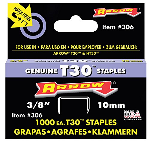 Fine wire staple. Made in the USA. The Arrow Fastener thin wire staples are ideal for home and DIY projects where you want the staple to be less visible. These staples are great for display people, window dressers, upholsterers, dinette and bar stool manufacturers, shippers, packers, silk screeners, toy makers, venetian blind manufacturers and other light nailing or tacking jobs. The 3/8-inch genuine thin-wire staples are designed for use with the T30 staple gun and HT30 hammer tackers. Made in the USA, the staples measure 3/8-inch (leg length) by 1/2-inch (crown size). Pack of 1,000.