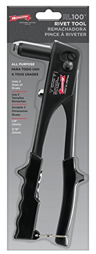 Limited Lifetime Warranty. The Arrow Fastener RL100S rivet tool offers solid all-around performance for most basic riveting jobs like gutters, HVAC work, and general repairs. Its value price makes it perfect for occasional or DIY use, and this simple but effective tool design features durable steel working components, spring loaded handles, lightweight feel, soft vinyl grips, 2 different size nose pieces, a nose changing wrench, and convenient handle lock for easy storage. For use with 1/8-inch, 5/32-inch and 3/16-inch rivets.