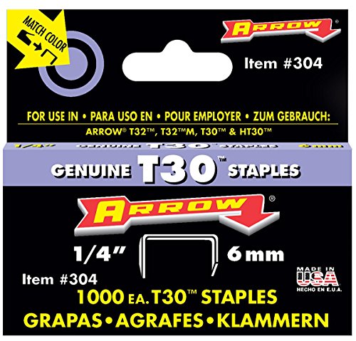 Made in the USA. The Arrow Fastener thin wire staples are ideal for home and DIY projects where you want the staple to be less visible. These staples are great for display people, window dressers, upholsterers, dinette and bar stool manufacturers, shippers, packers, silk screeners, toy makers, venetian blind manufacturers and other light nailing or tacking jobs. The 3/8-inch genuine thin-wire staples are designed for use with the T-32, T32-M, T30, T30N, and HT30 hammer tackers. Made in the USA, the staples measure 1/4-inch (leg length) by 1/2-inch (crown size). Pack of 1,000.