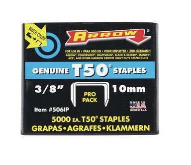 3/8" crown width x .050 wire. Arrow fastener T50 3/8in. ProPack Staple. Genuine Arrow T50 staples. 3/8" crown width. Fits TT50, T50X, T50R.E.D., ET50R.E.D., T50ELITE, T50, T50PBN, ETF50BN, ET501, HT50, HT55, 5700, 8004. Designed and Assembled in USA. 3/8" crown width x .050 wire. 2 boxes of 5,000 staples per box.