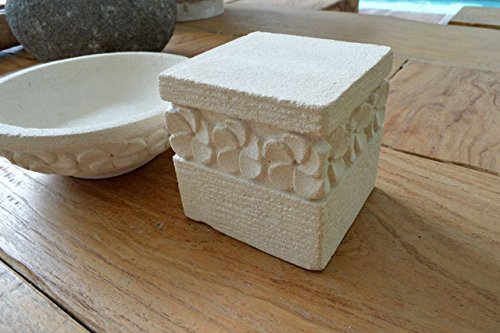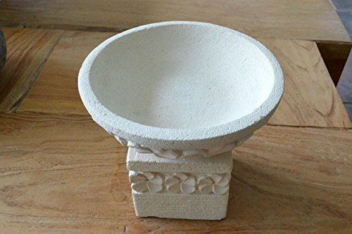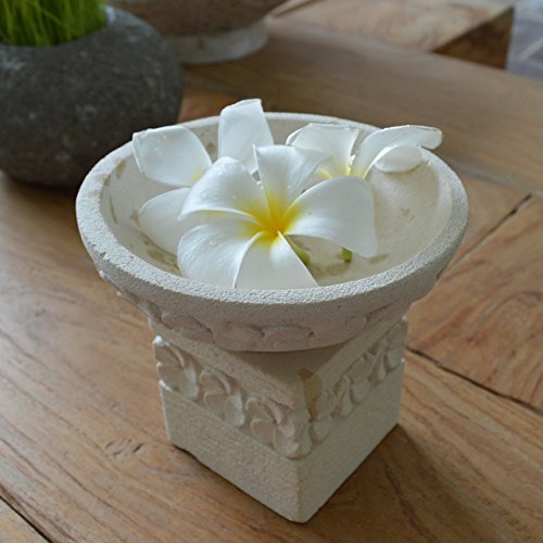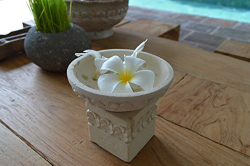バリ島のリゾートホテルやスパで見かける、プルメリアデザインがかわいい石彫りの睡蓮鉢。 付属品の白い小石とプルメリアの造花を飾るだけで、一気にバリ気分です。 ちょっとしたお部屋のアクセントにおすすめ。 ◆外に置くと パラス石は空気や水を含みやすい材質ですので、お庭など風雨のあたる所に置くことにより表面が朽ち溶け、やがて苔が生えて味のある感じに仕上がります。室内では白いままですが屋外に設置して石の変化を楽しむのもおすすめです。