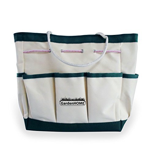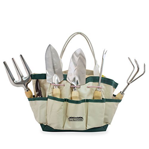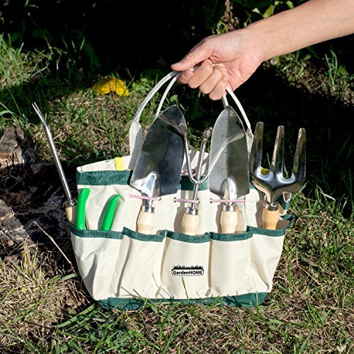 This seven piece master craft garden set includes everything you need for those gardening and landscaping projects. The garden tools fit conveniently in the attractive canvas tote so you can easily transport your tools as needed. The seven piece set includes: 1 Heavy weight polyester canvas tote (Size: 30x23 centimeter) with 7 pockets and elastic straps to store and secure the tools (Size: 25 to 28 centimeter). 1 Digger, 1 Pruning shear, 1 Rake, 1 Transplanter, 1 Trowel, 1 Weeding fork. Each wooden handle tool has stainless steel head (no. 304 stainless steel) size 25 to 28, 1 pruning shear (steel head with plastic handle). About GardenHOME: GardenHOME is an innovative North American developer of quality gardening tools.