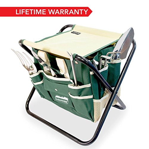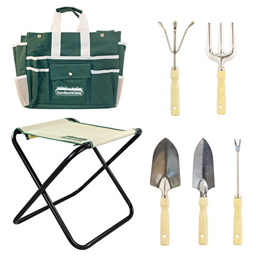 GardenHOME ガーデニングツールバッグと折りたたみチェアーセット【ステンレス製ガーデニングツール5点セット(移植鏝[こて]、移植スコップ、熊手、根起し、除草すき )】取り外し可能収納トートバッグと折りたたみチェアー付き