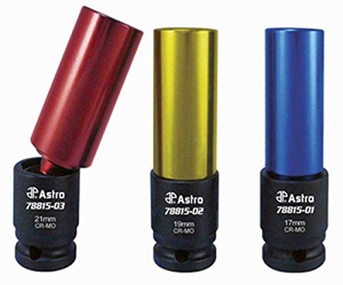 These sockets are 25-Percent-30-Percent more durable than traditional counterparts. Astro Pneumatic’s 3pc 1/2-Inch Drive Dual Function Deep Tire impact Socket Set includes a 17, 19, 21mm socket made of Chrome Molybdenum. Its oatented dual function design allows sockets to be used as Standard Sockets or 360-Degree Swivel Universal Sockets. Additionally, its hollow deep impact socket design creates room for removing longer bolts. These sockets are 25-Percent-30-Percent more durable than traditional counterparts.
