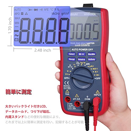 AstroAI true-RMS(真の実効値)マルチメーターは、電気専門家またはDIY好きなお客様のためにデザインされた、一般な製品よりパワフルで安全で正確に使用できる商品です。複雑なデバイスに見えるが、簡単かつ安全に使えます。電圧、電流、抵抗、導通、静電容量、周波数、ダイオード、トランジスタなどを1つのデバイスで測定できます。玄人向きですが、自動車や家庭における様々な電気問題にも簡単に解決できます。