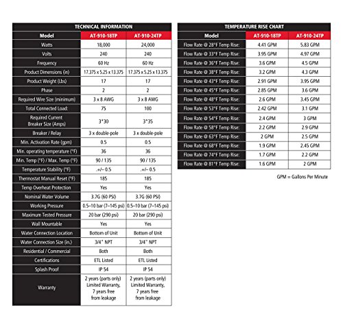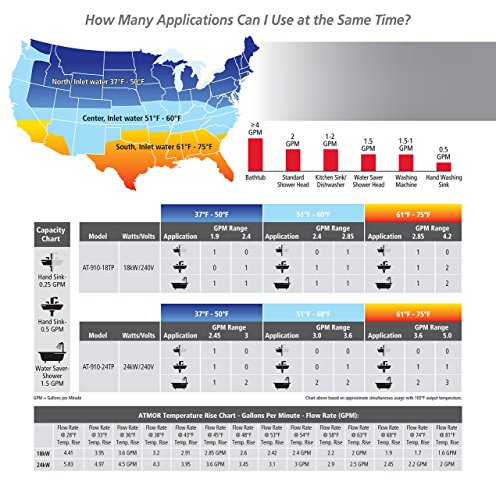 The Atmor thermopile tankless electric water heater revolutionizes water heating with smart flow technology that provides unlimited hot water when you need it, without the wait. This eco-friendly unit features the thermopro advanced self-modulating system that regulates water flow and the amount of energy required to heat the water, delivering major savings on your energy bill and lowering your water consumption. The easy-to-use digital panel gives you full control at all times with the power to make temperature adjustments down to the exact degree for the perfect water temperature every time. Providing you the flexibility to install anywhere inside your home or garage, the compact, space-saving design is IP54 certified to keep internal components safe and dry and requires no venting. Perfect for moderate to warm climates, the 18Kw/240V, 4.6Gpm capacity is ideal for small to medium sized homes that will be running up to 4 applications at Once, such as: 2 Showers (1.5Gpm/shower head), 1 kitchen sink (1Gpm), and 1 bathroom sink (.5Gpm) at inlet temperatures of 73 degrees F. Remember, choosing the right tankless heater depends on your incoming water temperature, flow rate, and your desired output temperature. Your incoming water temperature, also called inlet temperature, varies by location and seasonality. Colder inlet temps require the water heater do more to raise your water from chilly inlet temps to hot output temps. The difference between the inlet temp and your desired output temp is called the rise. Simply put, it’s how much your temperature needs to rise to deliver endless hot Showers. The next variable, flow rate (gpm), refers to the number of applications in your home that simultaneously provide hot water. When a higher rise is needed, a required slower flow rate limits the number of faucets that can heat your water at the same time. For additional info and help choosing a model, please see our selection guide below or call our support team at 888.783.6082.