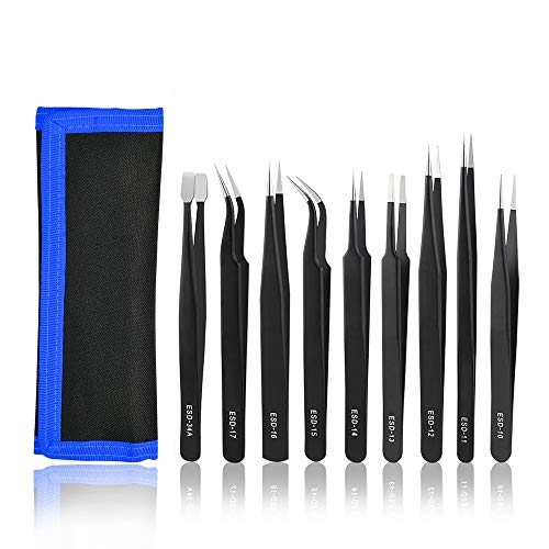 精密ESDピンセット Atpwonz 9本セット ツイーザー 種類豊富 防磁 静電気防止 精密機器 電子工作 模型製作 極細 黒 収納袋付