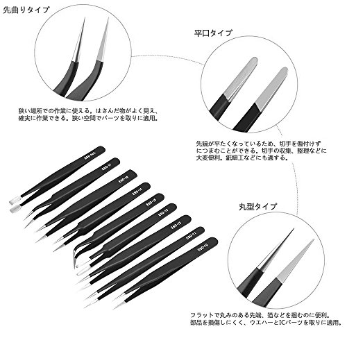 - ✔【種類豊富】平たい型、先曲り型、強化された型、極細型、丸型、ストレート型があるの9本ピンセットです。各種種類を判別する文字列がおしりのほうにあり、さまざまな作業によって、簡単に使い分けることができます。