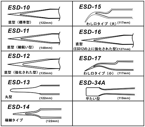 - ✔【9本ピンセット】ストレート型:ESD-10(122mm)、ESD-11(140mm)、ESD-12(135mm)、ESD-14(122mm)、ESD-16(127㎜) 丸型:ESD-13(122mm) 先曲り型:ESD-15(117mm)、ESD-17(122mm)、平たい型:ESD-34A (119mm)
