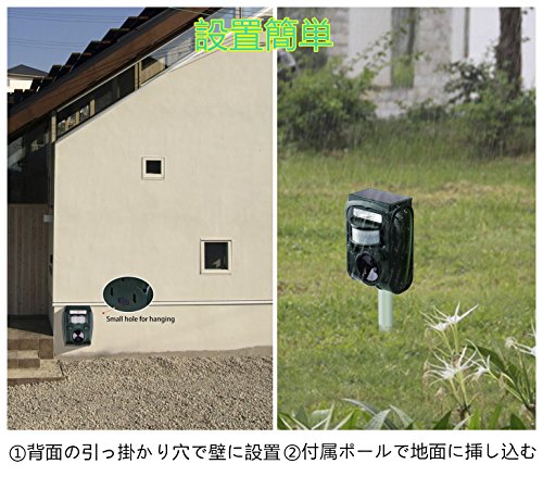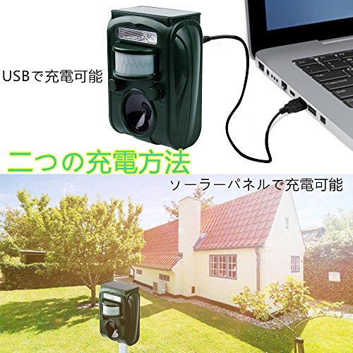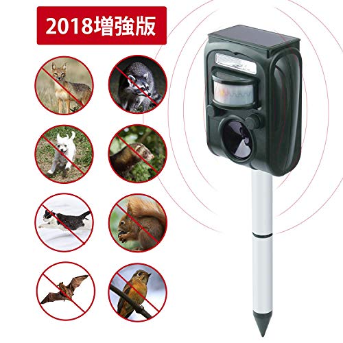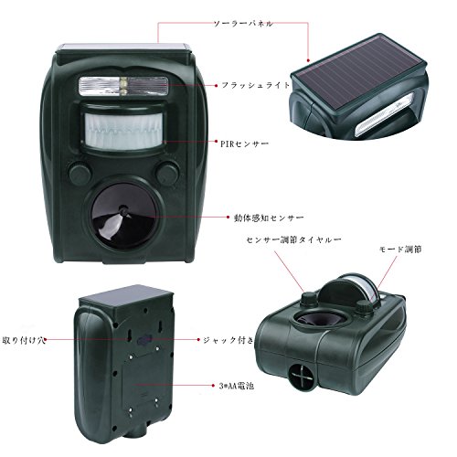 - 【超音波や光で動物を撃退】2017の最新バージョン、3つの優れた撃退攻撃,強力LEDフラッシュ、赤外線自動感知センサー、超音波発生スピーカーの3つでどんな害獣が来てもしっかり家や庭、畑を守る。動物が苦手な超音波&ブラッシュライトを発して、危害を加えずに動物を遠さげます。ネコ・イヌ・ネズミ・カラスなどによる糞尿・食害・騒音に、動物に怪我をさせることなく追い払います。誰も傷つかいで害獣害鳥とさよならでき、人体と環境に無害。