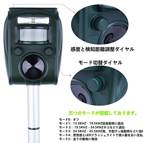 - 【センサー感知&モード調整】赤外線受動式センターで近づく動物を感知します。センサーの調節タイヤルで、センサー感知範囲の調整ができます。五つのモードが搭載しており、モード調整によりセンサの感知範囲を調整することができます