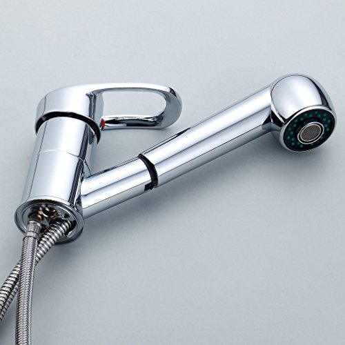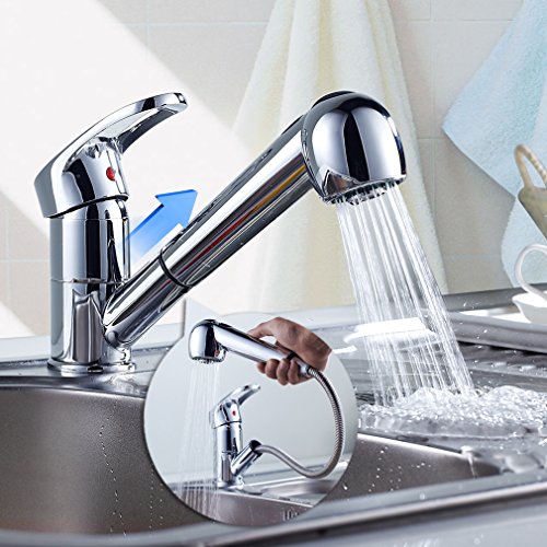 - 「キッチンや洗面用にとても使い勝手の良い、伸縮シャワーノズルタイプのシングルレバー混合水栓です」 引き出せるシャワーホース内蔵だから、キッチンのシンクや洗面ボウル回りで大活躍! 広いシンクや洗面ボウルもラクラク洗えます!