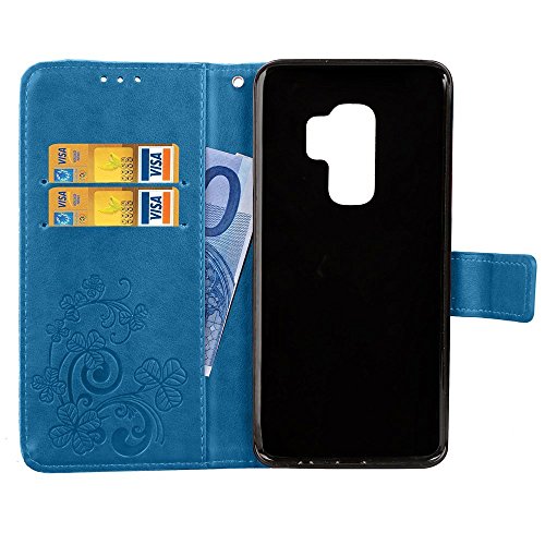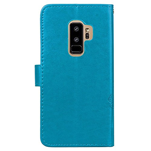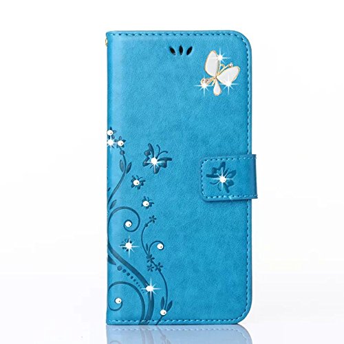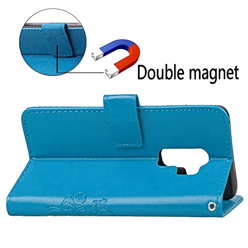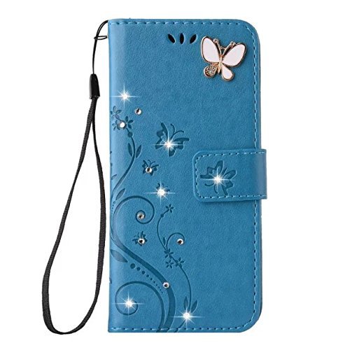 Auroralove ラグジュアリーハンドメイドラインストーン付きソフトスリムフリップスタンドウォレットケース Samsung用 フラワーバタフライ柄 PUレザーケース ガールズ レディース Samsung galaxy S9 ブルー