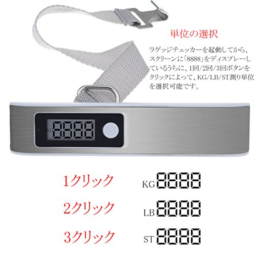 - 単位の選択:ラゲッジチェッカーを起動してから、スクリーンに「8888」をディスプレーしているうちに、1回/2回/3回ボタンをクリックによって、KG/LB/ST測り単位を選択可能です。