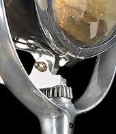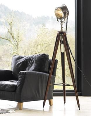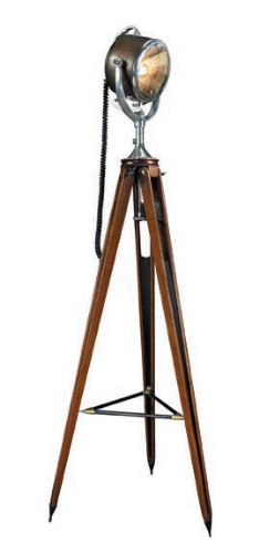 When a friend of mine decided to move to Berwick-on-Tweed to start a B&B in a 13th C. bastion (with walls 10 feet thick and 22 feet high) he was confronted with the problem of how to flood the walls with the right kind of light. Being a smart and enterprising person, a navy stock lot of 1930s Half Mile Ray lamps was located. Originally constructed to last a lifetime, he rigged them in series, and to the best of my knowledge they are still working. Our faithful reproduction is mounted on a mahogany tripod, its angle adjustable with a clever piece of 1930s technology. The overall look is cool, contemporary and at the same time historically correct.