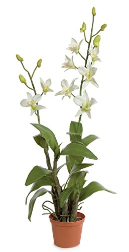 この人工的な蘭の植物は、屋内で表示され、コンテナを選択します。それは25インチの高さで、12インチの幅です。人工鉢植えのデンドロビウム蘭の花に、8つの18グリーンリーフ、クリーム色、7のつぼみとプラスチック製のポットは