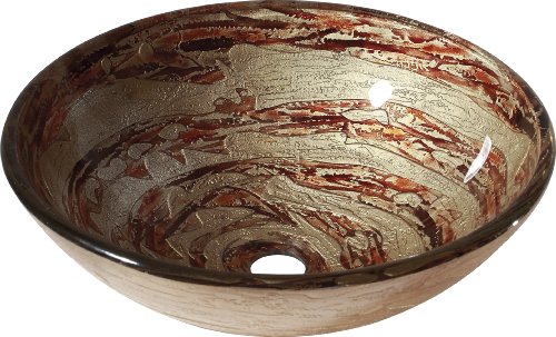 16.5W x 16.5D x 5.5H inches, Tempered glass for durability;Fused glass with copper swirl design provides a stylish, contemporary look, Round shape complements a variety of vanity and countertop designs;Designed for above-counter installation , No overflow outlet;Mounting ring required, not included;Round;16-1/2-Inch Diameter by 5.7-Inch h;Contemporary style