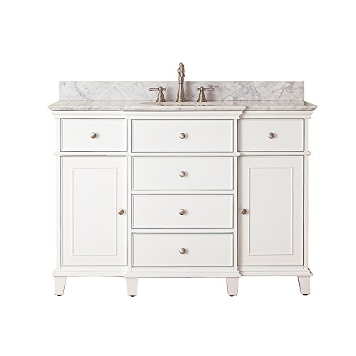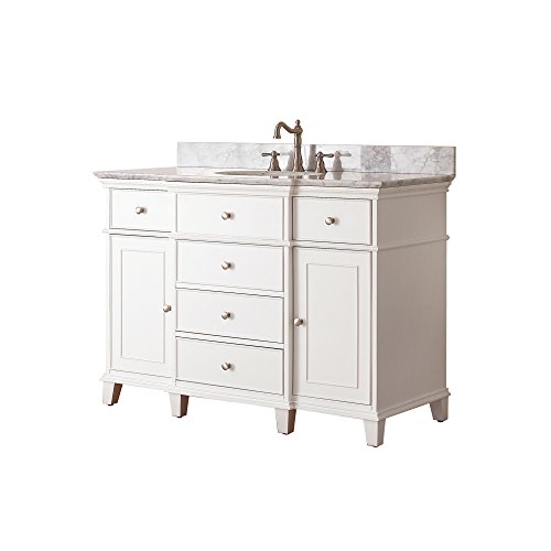 Avanityウィンザー48で。Vanity with Carreraホワイト大理石トップとアンダーマウントシンクinホワイト仕上げ