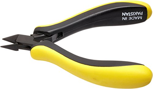 4-3/8" Mini tapered head cutter, flush, 24 AWG. Technik Ergo Cutters have been scientifically designed with your hand in mind. The ergonomic handle is slightly rounded and wide, creating excellent surface distribution. The handles are also ESD Safe, soft, comfortable and slip-free allowing you fatigue free, safe control for the most exacting work. These high quality pliers feature a precision box joint providing smooth action for exact guidance of jaws without the need for re-adjustment. The dual leaf springs are spot-welded to ensure smooth repetitive performance. Cutting edges are induction hardened to ensure long life. 24 AWG soft wire cutting capacity.